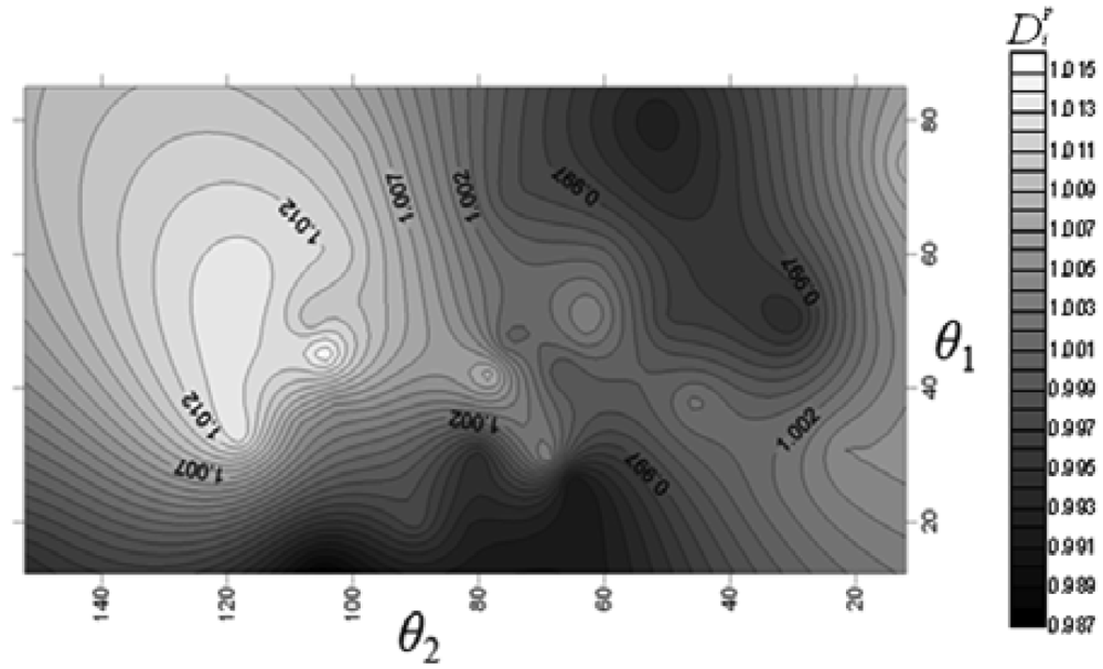 The results at ReD = 20, ReD = 50 and ReD = 75 are overlapped to find a better common area through image processing in Figure 5. The region within 20 < ReD < 75, 30° < θ1 < 57° and 110° < θ2 < 120° is the recommended area for the expansion valve angles with 1.02 < Dp,i < 1.14. The optimal region between the θ1, θ2 and Dp,i for D = 500 μm at 20 < ReD < 75, also confirmed by a numerical analysis software CFDRC version 2009 whose numerical accuracy of 10-5 makes it suitable for physical analysis.