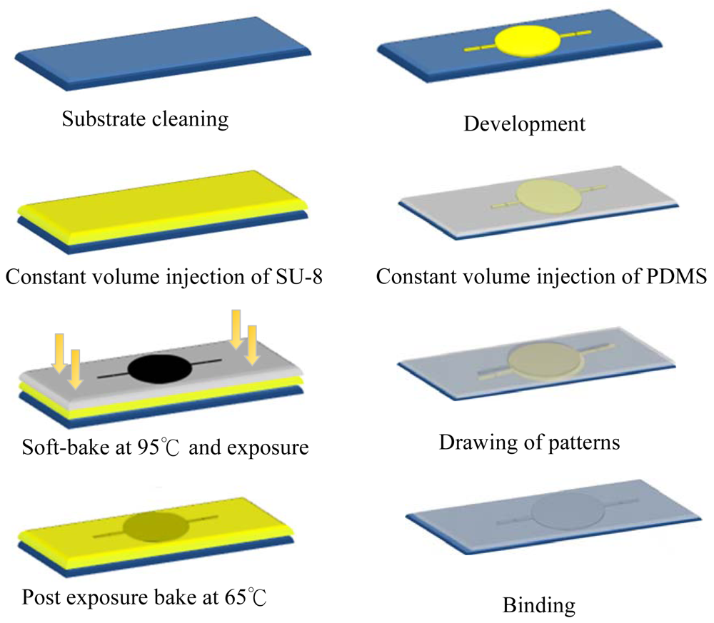 Because a pipe shaped flow channel with high depth had to be manufactured in this study, the spin coating method, which distributes SU-8 photoresist on the substrate, cannot be used. Therefore, the volume for the expected depth is calculated beforehand after referencing publication [19]. When the SU-8 photoresist undergoes the soft bake process, its total volume will be reduced by 20% due to loss of water. However, the total volume required will be made up through injecting photoresist to the substrate. Soft bake time is the most important parameter for the manufacturing of this deep SU-8 structure.