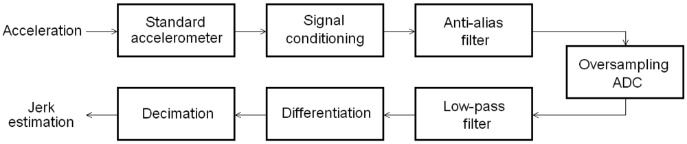 Figure 1 shows the block diagram of the proposed smart sensor for jerk monitoring. The system uses a standard accelerometer as primary sensor to measure acceleration. Signal conditioning and anti-alias filtering is then applied. Afterwards, the signal is converted to digital at an oversampling rate in the analog-to-digital converter (ADC). The quantized oversampled information is then filtered and differentiated to reduce the quantization noise. Finally, the resulting signal is decimated to give the estimation of jerk.