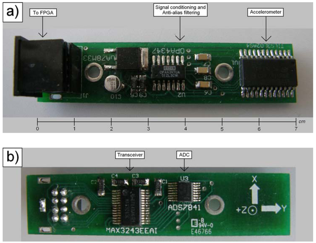 The proposed methodology for jerk estimation can be applied to any accelerometer. In our case a 3-axis LIS3L02AS4 accelerometer from STMicroelectronics [17] was used. The accelerometer has a user-selectable full scale of ± 2g/ ± 6g (g = 9.81 m/s2); a 5×10-4g resolution over a 100 Hz bandwidth; and a bandwidth of 1.5 kHz for all axes. The accelerometer is mounted in a PCB with the signal conditioning and anti-alias filtering, as recommended by the manufacturer. This PCB also contains a 4-channel, 12-bit sampling ADC from Texas Instruments ADS7841 [18], with a 200 kHz maximum sampling rate for each channel. The communication between the instrumentation system and the FPGA signal processing unit is done with a MAX3243 transceiver. Figure 10 shows the top and bottom views of the instrumentation system PCB.