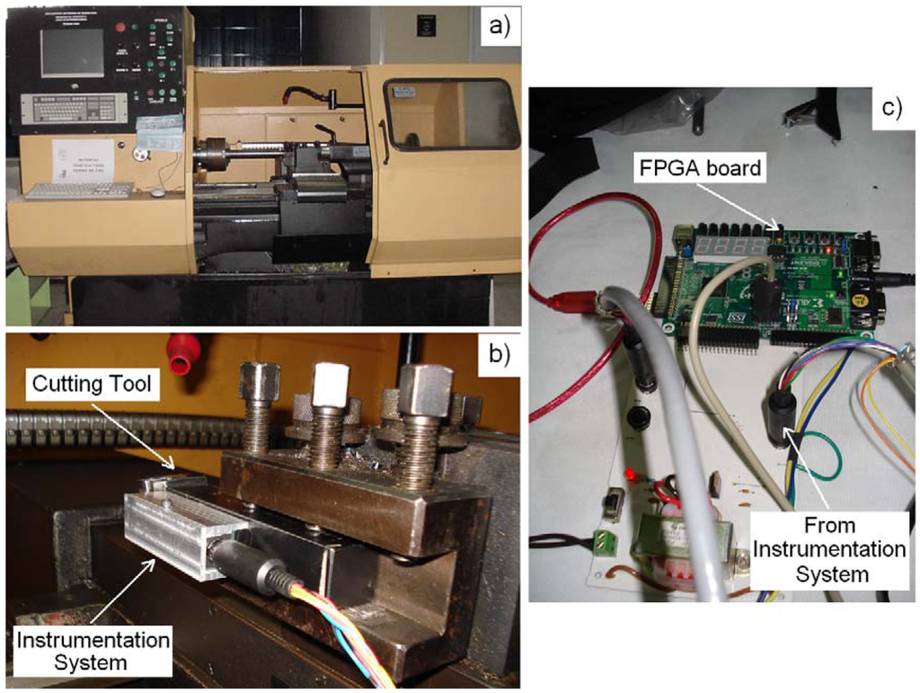 Experiment setup. (a) Retrofitted CNC lathe. (b) Instrumentation system mounting. (c) FPGA-based signal processing unit.