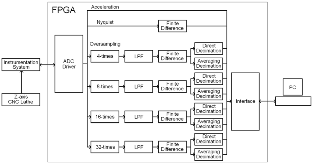 To increase the system resolution for improving SQNR is not always possible in certain applications because the cost could increase beyond the economical restrictions. On the other hand, for low-frequency applications such as jerk monitoring in CNC machines [9,10] where sampling rates are in the order of few kHz, the resolution can be maintained while the improvement is given by oversampling; this is possible considering that there are plenty of low-cost, commercially-available, sampling ADC circuits that easily handle sampling rates in the order of 100 kHz. In order to take advantage of the SQNR by oversampling, further digital signal processing is necessary, but this can be achieved with low-cost field programmable gate arrays (FPGA) [1].