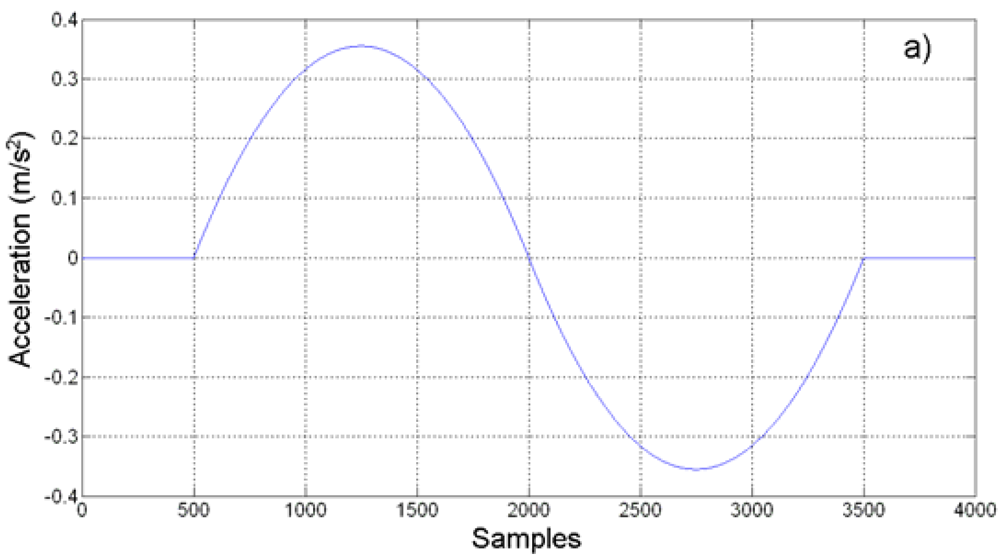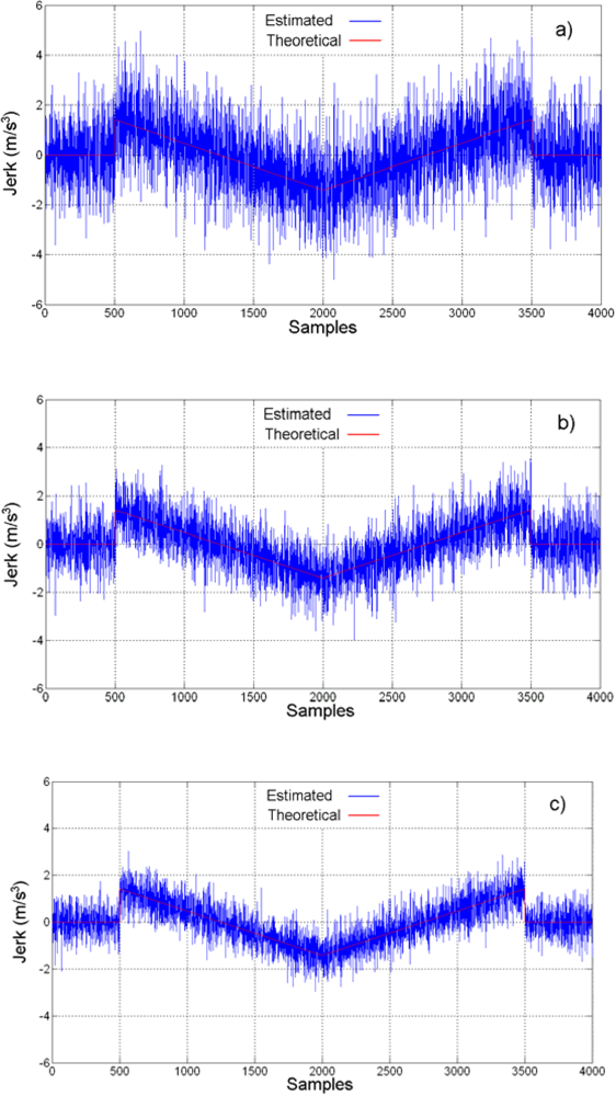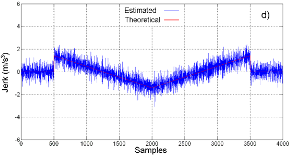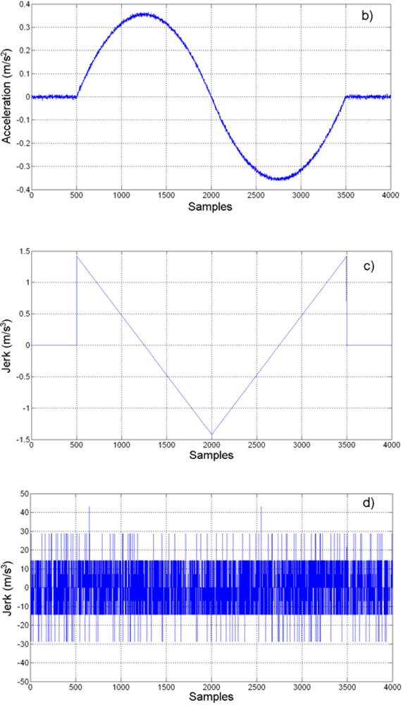 Figure 7 shows the obtained results for jerk estimation from the acceleration profile. The theoretical jerk is shown in Figure 7a. Figure 7b shows the jerk as estimated by finite differentiation at the Nyquist sampling rate. Figures 7c-f contains the estimated jerk with the proposed methodology for 4-, 8-, 16-, and 32-times oversampling, respectively. As expected, direct finite differentiation for jerk estimation gives a highly corrupted signal that takes quantized integer values in the range: [-2, 2]. Jerk estimation with the proposed methodology greatly improves resolution on results, even for the 4-times oversampling rate.