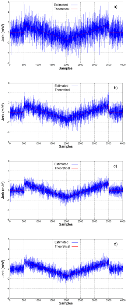 Jerk estimation with oversampling and averaging decimation. (a) 4-times. (b) 8-times. (c) 16-times. (d) 32-times.