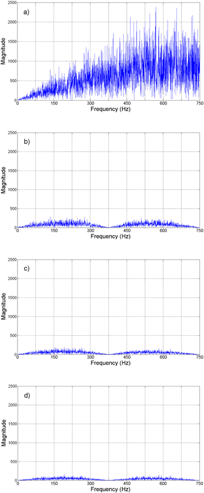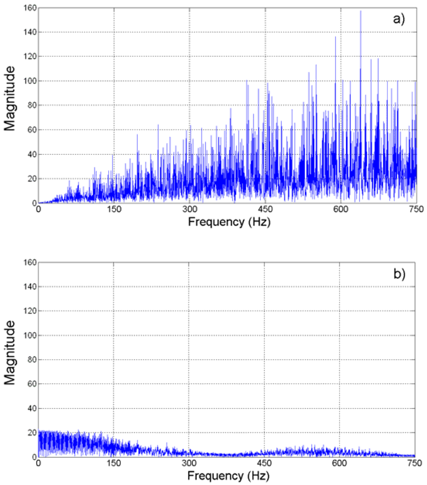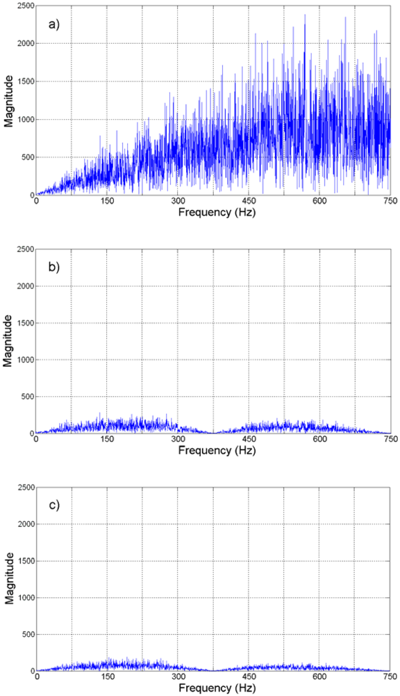The operating parameters of the instrumentation system for the experiment are set as follows: acceleration range of ± 2g (± 19.62 m/s2); 12-bit resolution at the ADC; 0.66 V/g sensitivity; one acceleration axis monitoring; anti-alias filter tuned to give a signal bandwidth BW = 750 Hz; Nyquist sampling rate fs = 1500 Hz; and 4-, 8-, 16-, and 32-times oversampling rates.