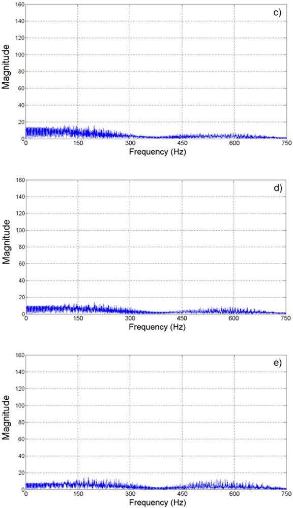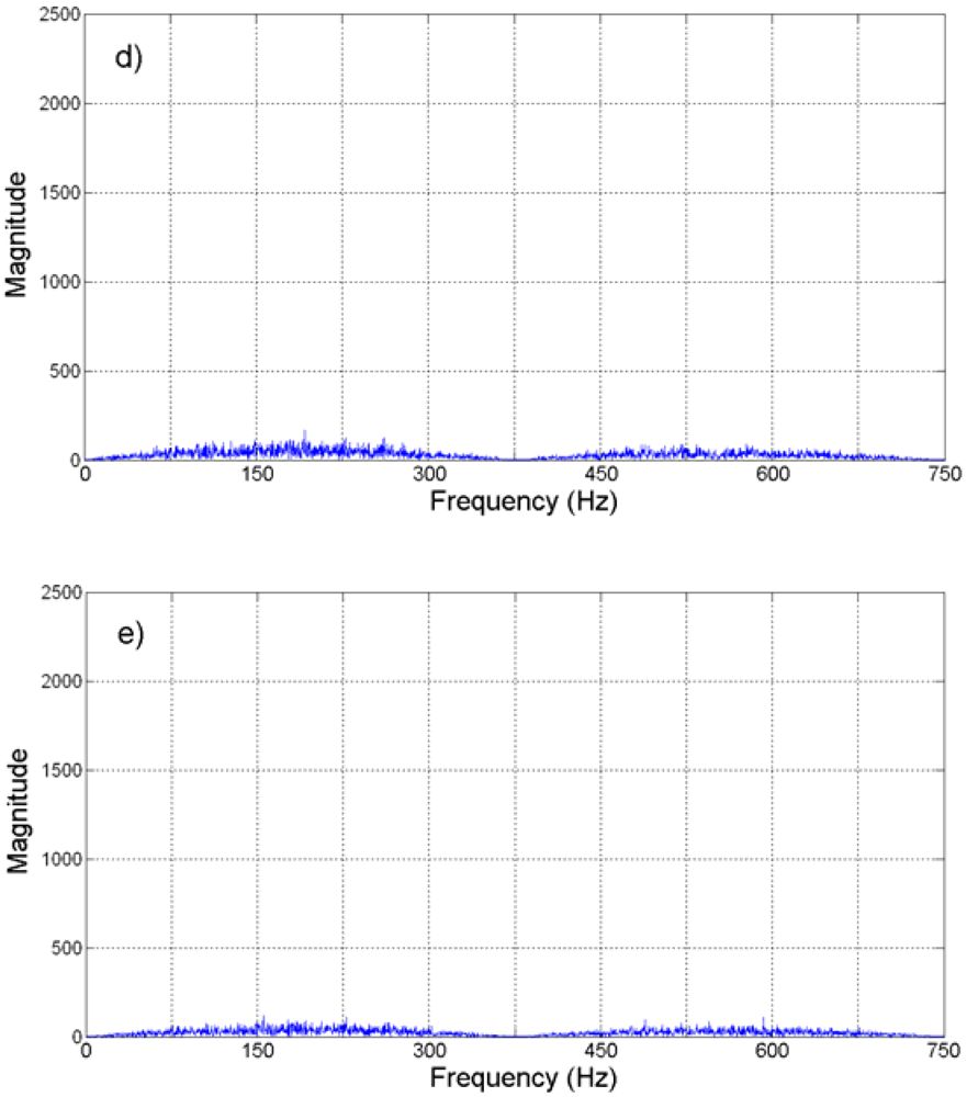 Spectra of quantization error for jerk estimation. (a) Nyquist rate. (b) 4-times oversampling. (c) 8-times oversampling. (d) 16-times oversampling. (e) 32-times oversampling.