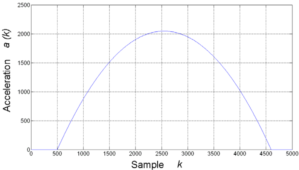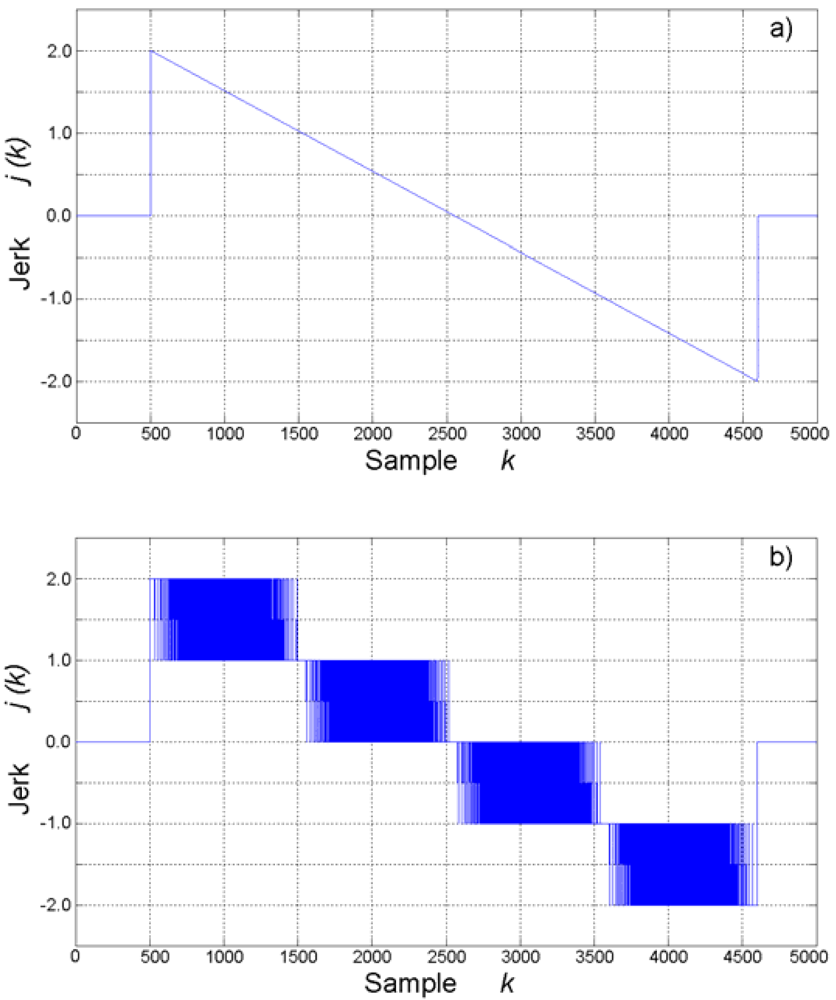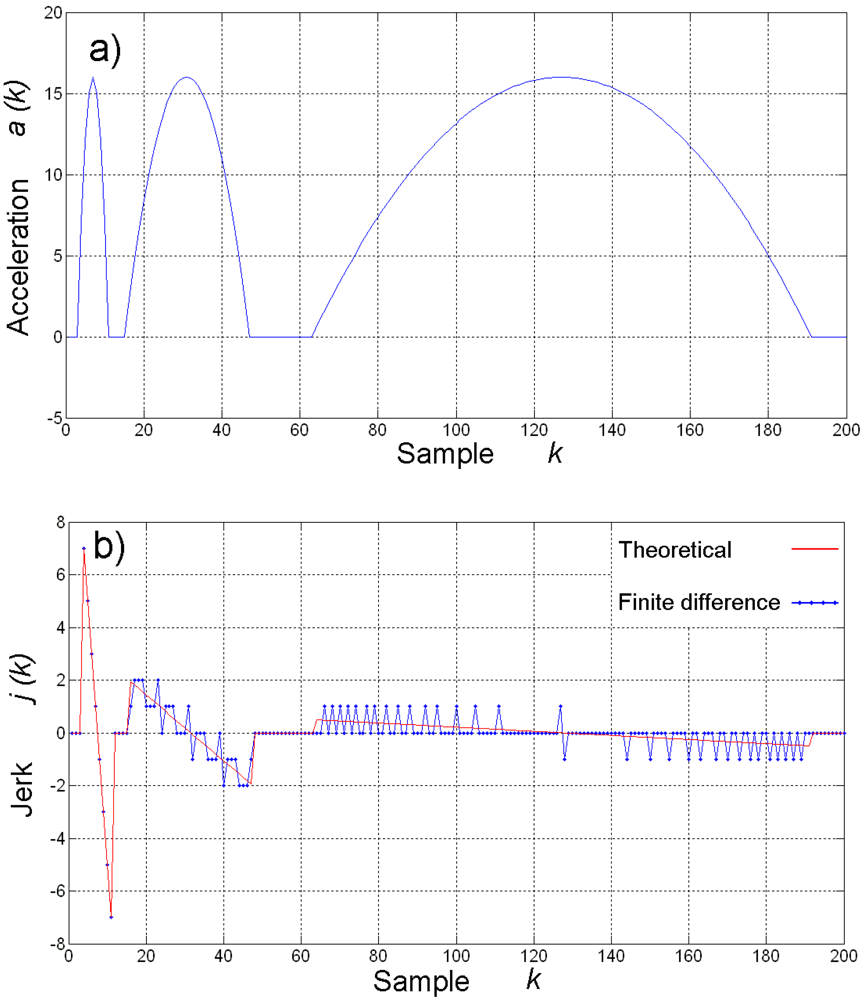 Being a(k) an n-bit quantized signal that takes values in the range: [–2n–1, 2n–1–1], the resolution of its finite difference is inversely dependent on the change rate of a(k). This means that the resolution of j(k) remains the same for a quick-changing a(k), but the resolution is decreased for a slow-changing a(k). To illustrate this effect consider Figure 2. Figure 2a shows a typical quadratic acceleration profile a(k) with quick-, medium-, and slow-changing piecewise segments. On the other hand, Figure 2b shows the theoretical and the finite-difference derivatives j(k).