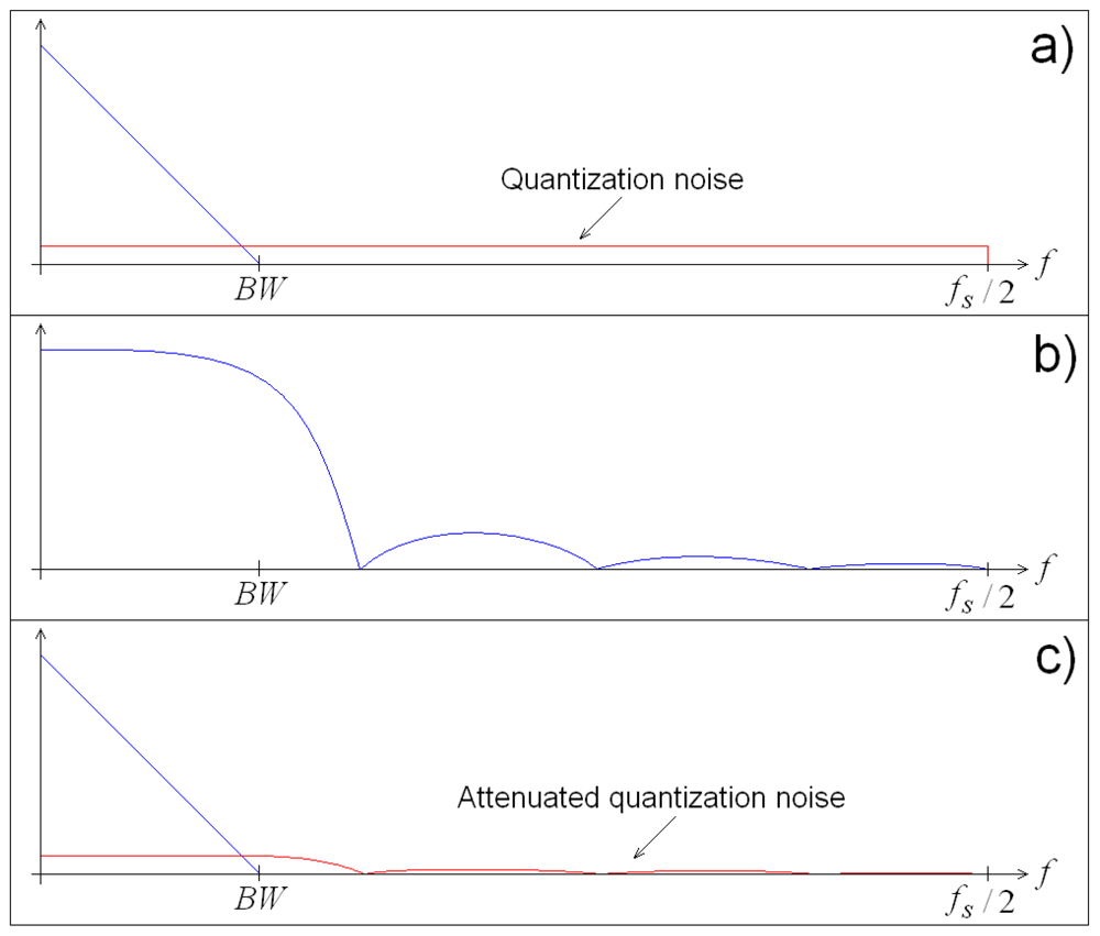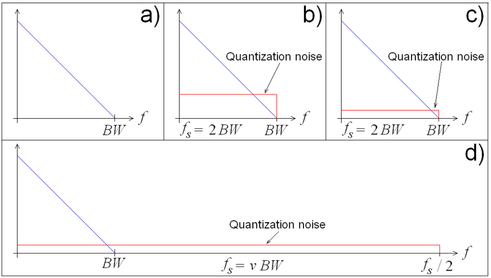 This equation suggests that SQNR can be improved in two ways: by increasing resolution n, or by increasing sampling rate fs with further filtering. This improvement can be appreciated in Figure 3. Figure 3a shows the noiseless spectrum of a band-limited signal, Figure 3b shows the effect of the quantization noise over the n-bit resolution signal sampled at the Nyquist rate (absolute minimal sampling rate) fs = 2BW, Figure 3c shows the improvement when resolution is increased while maintaining the Nyquist sampling rate, and Figure 3d shows the improvement when maintaining resolution n with ν-times oversampling.