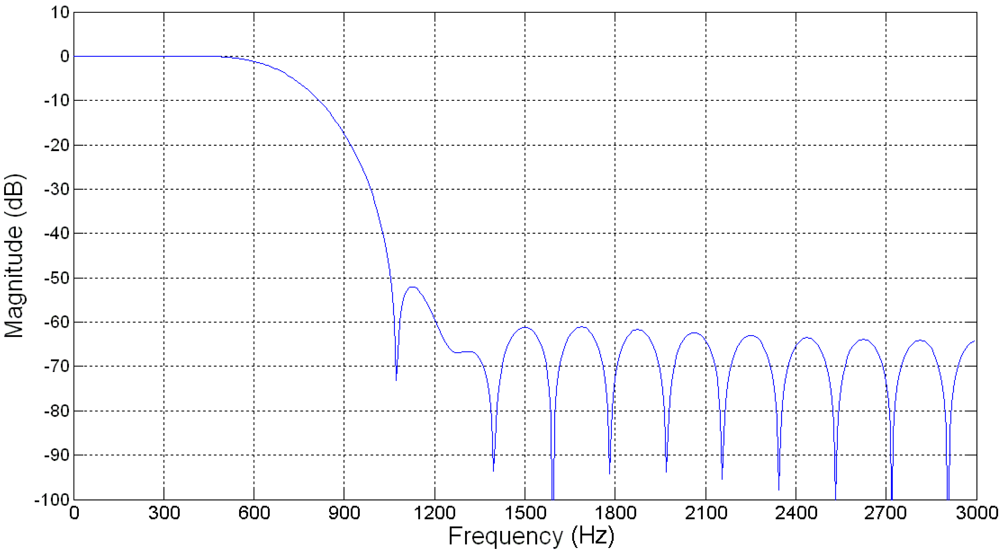 The digital processing of the signal consists of three stages: filtering, differentiation, and decimation. For this experiment, a 32nd order, Hamming window, finite-impulse response (FIR) LPF [16] is proposed. The cut-off frequency is set at the original signal bandwidth BW, giving this filter 6 dB of attenuation at the cut-off frequency. Other filtering schemes can be utilized at this stage, having in mind the rejection characteristics on the oversampled band. Figure 5 shows the frequency response of the FIR LPF magnitude, for the 4-times oversampling case at a sampling frequency fs = 6,000 Hz. This filter has an excess of 50 dB attenuation at the suppression band.