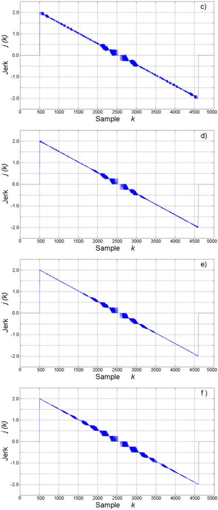 Jerk estimation. (a) Theoretical. (b) Nyquist rate. (c) 4-times oversampling. (d) 8-times oversampling. (e) 16-times oversampling. (f) 32-times oversampling.