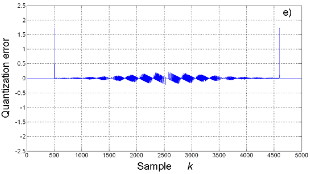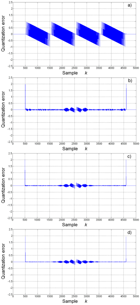 The quantization error, calculated by subtracting the estimated jerk from the theoretical waveform, is shown in Figure 8. The quantization noise in the jerk estimation at Nyquist sampling rate (Figure 8a) is noticeable. Quantization noise presents significant reduction with the proposed methodology from 4-times oversampling and up. Quantization noise is further reduced at higher oversampling rates, up to a certain level, where the oversampling no longer improves the SQNR. For instance, SQNR is improved from 4-times up to 16-times oversampling, but the improvement is no longer evident at 32-times oversampling.