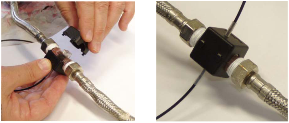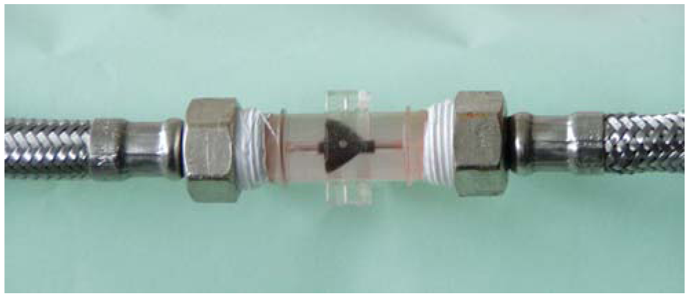 The mechanical part is composed of a two-blade rotating propeller turning around its axis as the fluid passes through the pipe, as shown in Figure 2. This rotation affects light coupling from one POF to another when both are placed in line a short distance apart, with the propeller in between. This set-up generates an optical pulse train when the relative position of the propeller changes in relation to the emitted light beam. This pulse train is then sent to an optoelectronic system by means of the second POF.