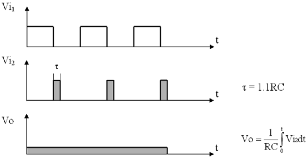 The sensor propeller is installed in the pipe where the fluid is circulating. When the two blades rotate, they interrupt the light path, and intermittent pulses are generated. The rotation speed depends on the flow rate. A trigger control circuit has been designed to measure the width of all pulses as accurately as possible, Vi1. It is triggered by down edges and it employs the NE555 IC set in the measuring circuit input, Vi2. This allows us to obtain pulses with a constant width, which will be connected to a measuring circuit, as shown in Figure 3.