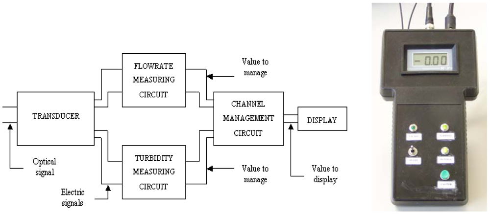 A channel management circuit has been designed to avoid using two displays to visualise two different kinds of information. Using a switch, one kind of information or another can be displayed. An analogue multiplexer has been used for this design. The measurement circuit outputs for turbidity and flow rate are connected to the management circuit. A switch is connected to one RS flip-flop and, after that, its output is connected to a J-K latch, and this generates a control signal. By means of this generated control signal, the displayed signal is connected to the LCD display circuit, as shown below. The complete block diagram and the unit control for the sensor appear in Figure 5.