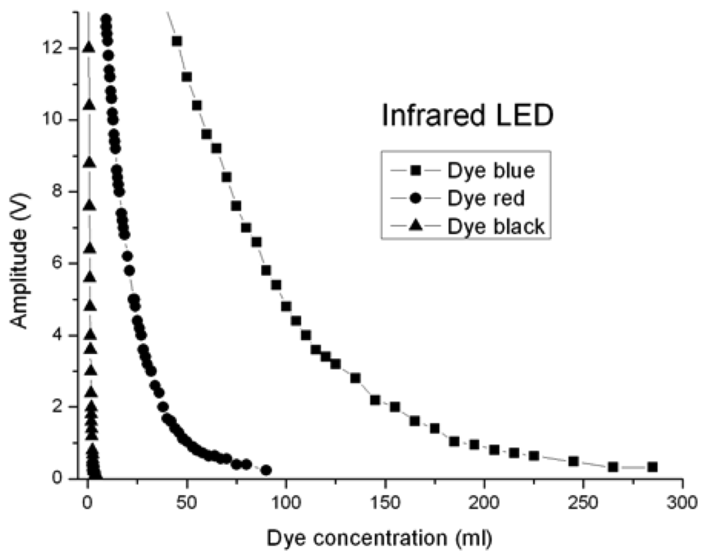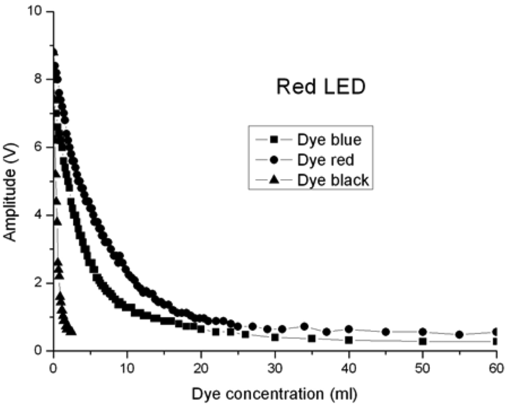 Figure 7 shows a comparative study of three graphs obtained with the red, black and blue dyes, using a red LED where λ = 660 nm. The vertical axis shows the signal amplitude expressed in volts, whereas the horizontal axis shows the concentration dye expressed in mL per 10 litres of water. The greatest loss takes place with the black dye, followed by the blue dye and finally the red one.