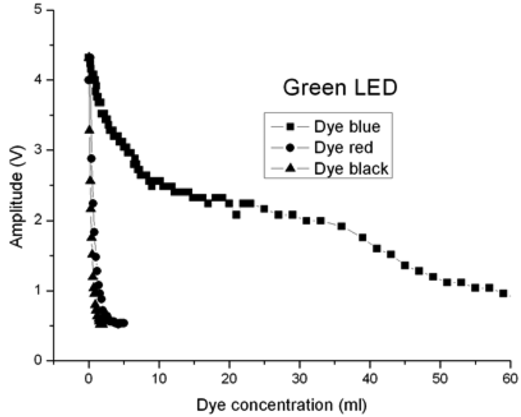 Red (660 nm), green (530 nm) and infrared (880 nm) LEDs have been used to measure turbidity. The optical fibre used is a PMMA POF with a core diameter of 730 μm; the optical fibre lengths for emission and reception are 1.5 m. At the request of a company working with different kinds of dyes, the turbidity tests were carried out using a volume of 10 litres of water, with different dyes, which affect the signal amplitude value. Red, black and blue commercial dyes were used.