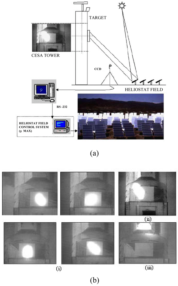 (a) Schematic illustration of vision-based heliostat control system, and (b) photographs showing different shapes of sun images projected by heliostats onto target plane: (i) centered ellipsoids (the shape of the ellipsoid changes during the day), and (ii), (iii) ellipsoids outside of target boundaries due to aiming errors. Reproduced with permission from Elsevier [].