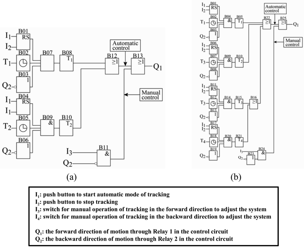 Functional PLC program for plane rotated about (a) south-north axis and (b) about vertical axis. Reproduced with permission from Elsevier [].