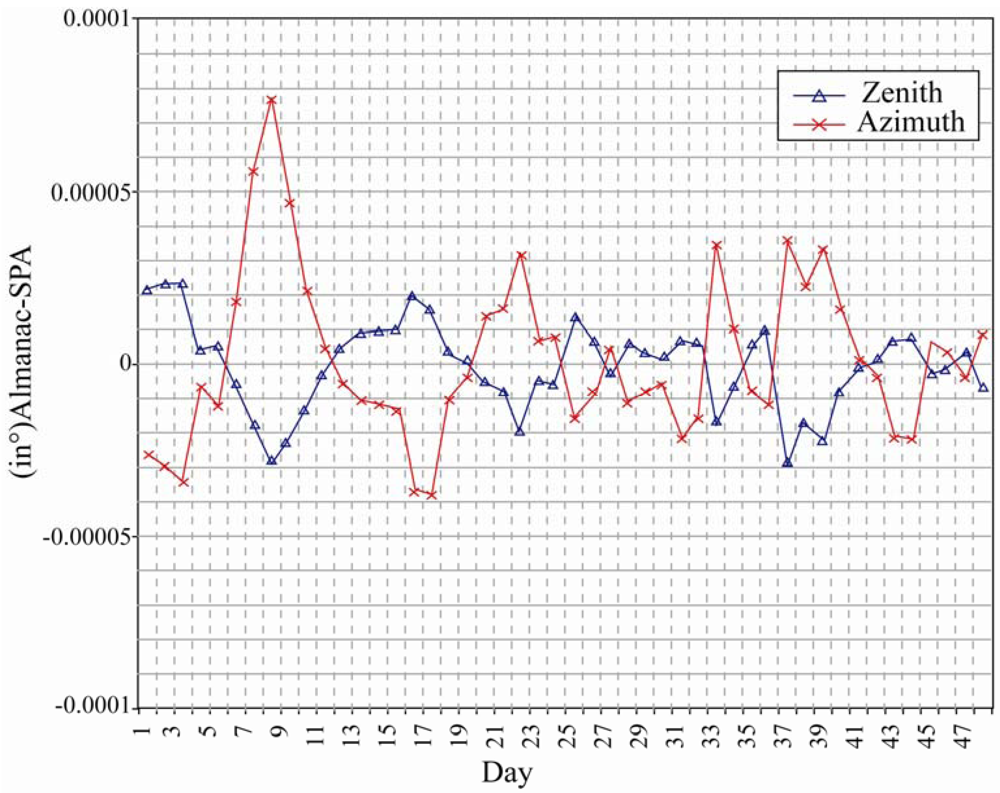 In a recent study, Grena [] presented an algorithm for obtaining highly precise values of the solar position. Taking the fractional Universal Time (UT), the date, and the difference between UT and Terrestrial Time (TT) as inputs, the algorithm computed the angular position of the earth with respect to the sun in the ecliptic plane and then used this angle and the inclination angle of the earth's rotational axis to calculate the position of the sun. In the previous algorithms, the maximum error was ± 0.0003° []. It was shown that the maximum error of the proposed algorithm, i.e. 0.0027° (Figure 9), was higher than that of the algorithm presented by Reda and Andreas [], i.e. ± 0.0003°, but was sufficient for most solar engineering applications and could be obtained at a fraction of the computational cost.