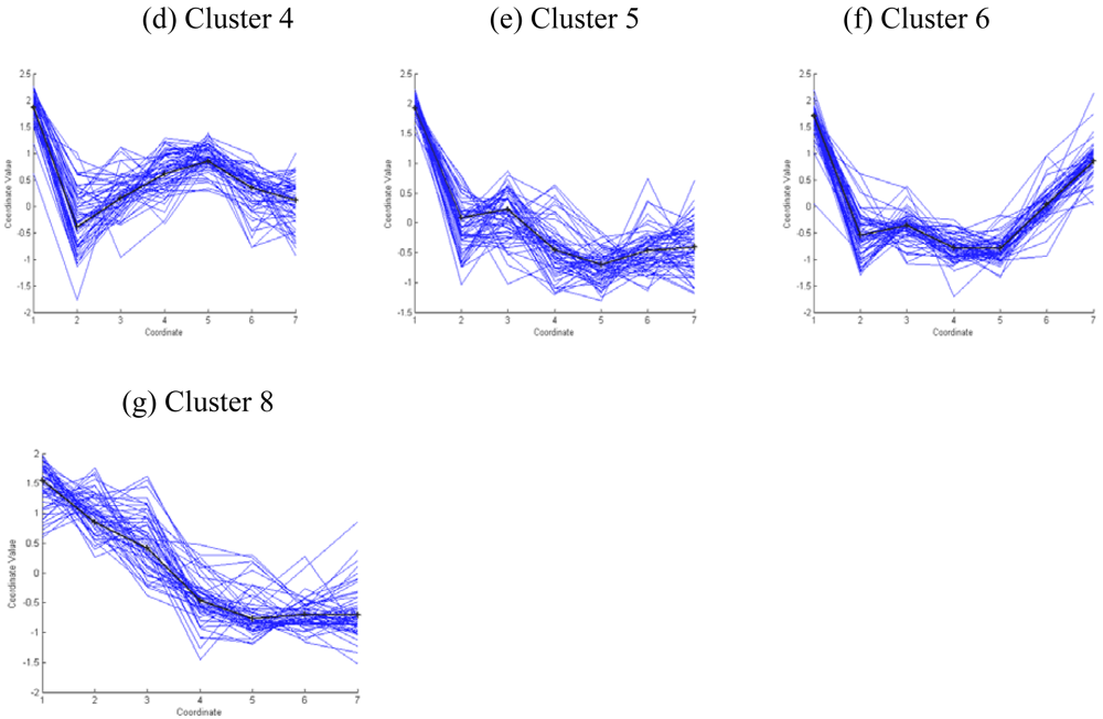 In this section the best clustering solution provided by different algorithms on the sporulation data of yeast has been visualized using the cluster profile plot (in parallel coordinates) and the heatmap plot in MATLAB 7.0.4 version. Parallel coordinates [] is a common way of visualizing high-dimensional geometry. A point in n-dimensional space is represented as a polyline with vertices on the parallel axes; the position of the vertex on the i-th axis corresponds to the i-th coordinate of the point. Cluster profile plots (in parallel coordinates) of seven clusters for the best clustering result (provided by MODE) on yeast sporulation data has been shown in Figure 10. The blue polylines indicate the member genes within a cluster while the black polyline indicates the centroid of that gene. Cluster profile plots (Figure 10) also demonstrate how the cluster profiles for the different groups of genes differ from each other, while the profiles within a group are reasonably similar.