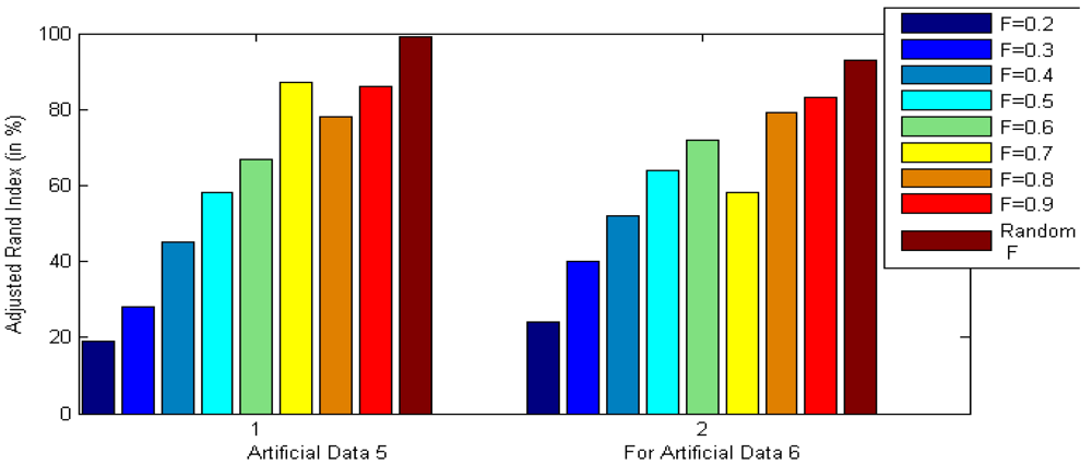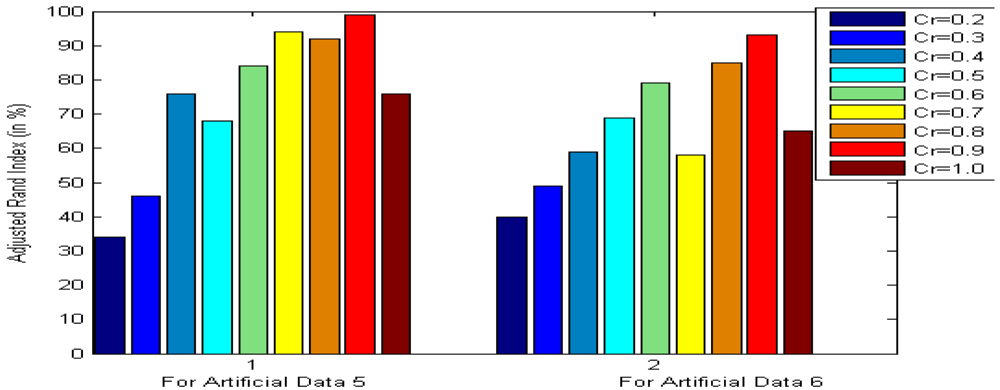 All the multi-objective DE variants have been used with 40 parameter vectors in each generation and each run of each algorithm was continued for 100 generations. The value of scale factor F is a random value between 0.5 and 1 and Cr was fixed at 0.9. These parameter values have been recommended for DE after performing a series of hand-tuning experiments. First we use standard values of F (0.8) and Cr (0.9) [] and repeat the clustering techniques on various datasets with varying population size NP. We find that keeping NP around 40 gives reasonable computational time over a wide range of datasets. Next, fixing NP at 40 we varied F and Cr respectively and obtained the clustering results on several datasets in terms of the adjusted Rand index. Figure 2 shows a glimpse of these experiments with MODE on artificial datasets 5 and 6 for various values of F, keeping Cr at 0.9. In each case we report the average adjusted Rand index for 30 independent runs of the algorithms. Similarly Figure 3 presents the final accuracy of MODE on the same two datasets for various values of Cr keeping the value of F random between 0.5 and 1.5. It is evident from both the figures that the suggested parameter setting (F random and Cr = 0.9) gives best clustering performance with the multi-objective DE variants. We do not provide the results for all the available datasets to save space and considering the fact that they show more or less similar trend as shown in Figures 2 and 3.