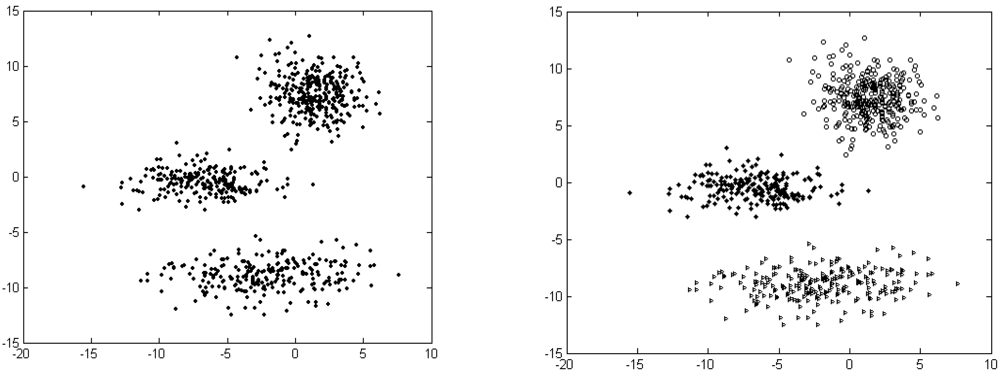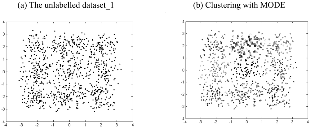 The results listed in Tables 2 to 4 indicate that there is always one or more multi-objective DE variant that beats the NSGA II or MOCK in terms of mean Silhouette index and adjusted Rand index in a statistically significant fashion. The six unlabelled artificial datasets and the corresponding clustered data with the best performing algorithm (which happens to be one of the two multi-objective DE variants) have been depicted in Figures 4 to 9.