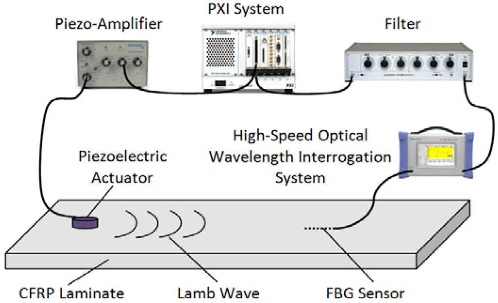 A tunable laser source was used in the present study for guided wave detection. As shown in Figure 1, a PXI-6115 (National Instruments Co., USA) simultaneously functions as an incident wave generator and wave acquisition device. The generated incident wave was amplified by a Piezo-Amplifier (M-2643, MESS-TEK Co., Japan) and was emitted into the specimen by a PRYY-0929 PZT actuator (Physik Instrumente GmbH & Co. KG, Germany) to excite Lamb guided waves. FBG receives guided waves as the strain change of the laminate depending on time and, therefore, center the wavelength of the reflected light from the FBG changes. The wavelength shift is detected using the high speed optical wavelength interrogation system. Finally, the PXI-6115 acquires guided waves filtered by the filter FV-628B (NF Corporation, Japan). FBGs (Fujikura Ltd., Japan, gauge length: 3 mm, wavelength: circa 1,550 nm, full width at half maximum (FWHM): circa 0.5 nm, and reflectivity: > 90%) were used in the present study.