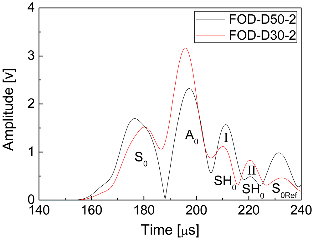 Moreover, features of the FOD sensor-based results in Figure 8(d) are greatly different from the FBG-based results in Figure 6(d), which is that several extra crests PEx are present between the transmitted A0 Lamb waves P2 and the right end-reflected S0 Lamb waves P3 in the envelopes of the FOD-based signals. According to the literature [24,37], when the incident wave propagates in an isotropic beam containing delamination, the shear horizontal (SH) guided wave, traveling in a direction perpendicular to the plane of particle motion, can be converted from the incident Lamb guided wave as a result of the interaction between transmitted Lamb waves and delamination in CFRP laminates [24], so as to stratifying the boundary conditions along the discontinuities. It has also been proved that FBG sensor has directivity in ultrasonic detection [5], which is that FBG is not sensitive to the vibration that is perpendicular to the optical fiber. Since the PEx waves cannot be detected using the FBG sensors, particle motion should be perpendicular to the direction of wave propagation, which is the characteristic of SH guided wave. Moreover, the CFRP laminates in the present study can be considered quasi-isotropic plates [37]. Therefore, these extra crests PEx should be the Lamb wave-induced fundamental shear horizontal (SH0) guided waves.