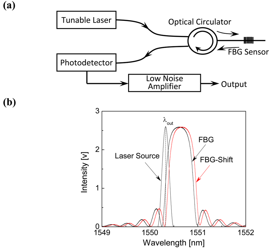 Sketch of the high-speed optical wavelength interrogation system in Figure 1. (a) FBG-based ultrasonic detection system. (b) A schematic illustrating the variation in reflectivity at the lasing wavelength when the FBG sensor expands.