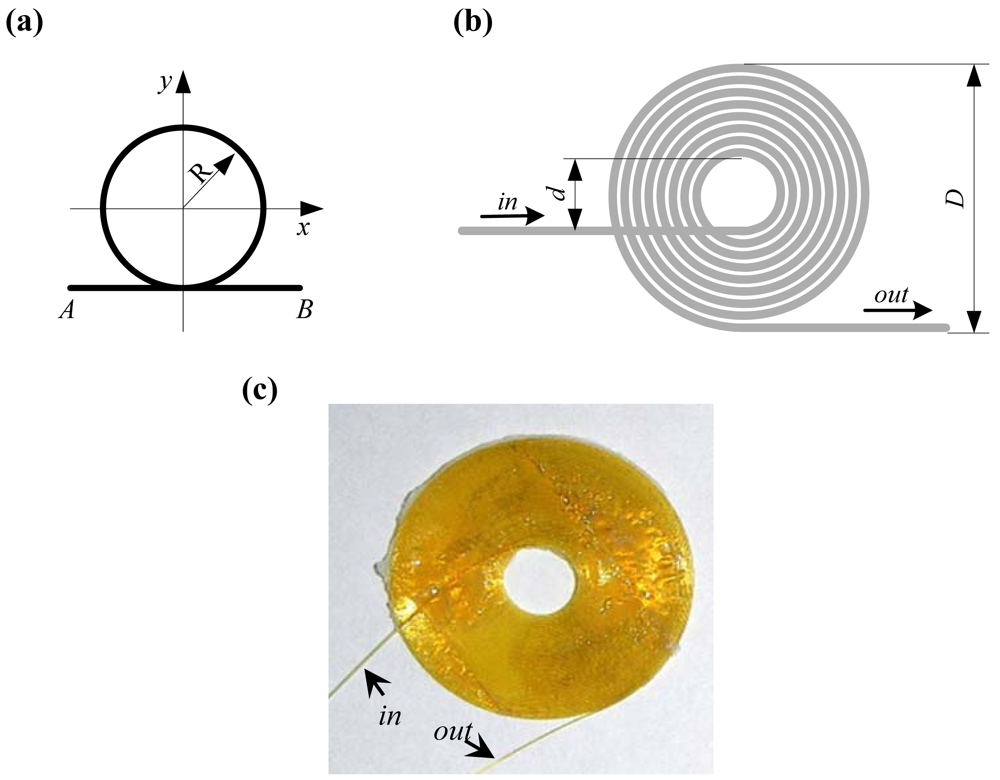 (a) Sketch of circular loop FOD sensor. (b) Sketch of spiral FOD sensor. (c) Picture of the spiral FOD sensor with outer diameter 21.2 mm.
