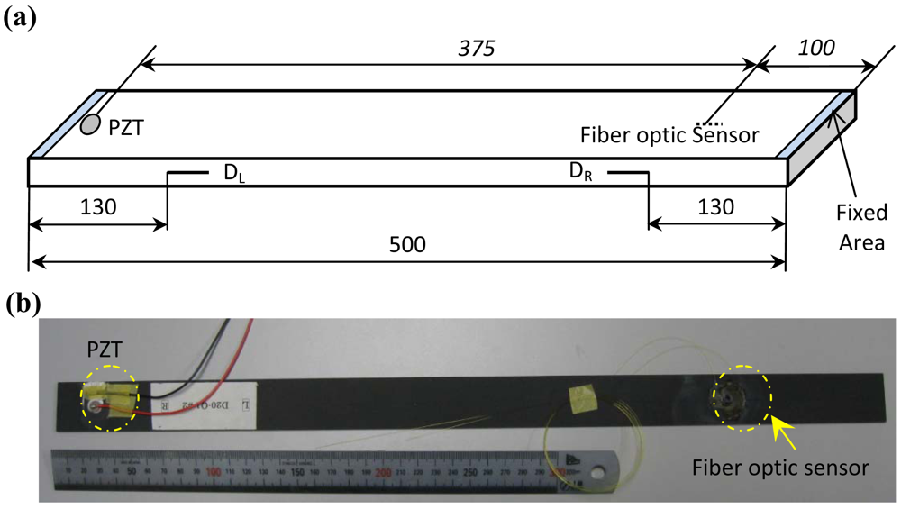 For illustration and without losing generality, quasi-isotropic CFRP laminates are used as host structures for fiber optic sensors-based guided wave and damage detection in the present study. The quasi-isotropic laminates were stacked in accordance with [45/0/-45/90]2s using Pyrofil™ carbon fiber (TR30S, Mitsubishi Rayon Co., Ltd., Japan) with technical properties listed in Table 1. Laminates were fabricated with the dimension of L 500 mm × W 30 mm × TH 1.92 mm. Two types of CFRP laminates were applied in the present study, which are intact and delaminated laminates. Sketch and picture of the specimen are shown in Figures 5(a) and (b), respectively, with the locations of piezoelectric (PZT) actuator, fiber optic sensors and delaminations. In the experiments, the left and the right ends of the specimens were respectively fixed with length of circa 2 mm. For the delaminated CFRP laminates, single- and double-damage scenarios were introduced by inserting one and two thin Teflon® films between the 8th and the 9th laminas of the laminate, respectively. The two delaminations are named DL and DR, respectively. For the single-damage laminate, only the DL exists. On the other hand, both the DL and DR are present in the CFRP laminate with two delaminations. To ensure that the guided wave signals are acquired under the same excitation circumstance for the same specimen, experiments for one specimen were done under three procedures: 1) acquiring guided wave signal using FOD sensor; 2) removing the FOD sensor from the specimen and bonding FBG sensor at the same position as the FOD sensor; 3) acquiring guided wave signal using the FBG sensor.