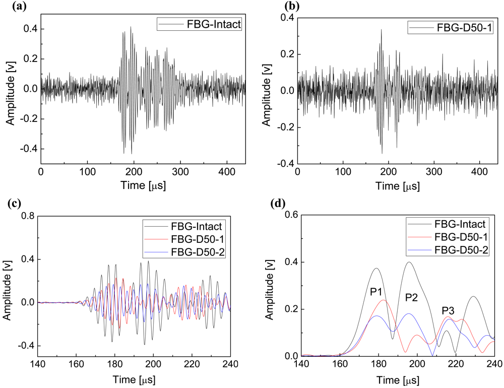 In comparison with the filtered signals in Figure 6(c), it is evident that features of the guided wave signals are more clearly disclosed by taking advantage of Hilbert transform, as shown in Figure 6(d). The legends ‘FBG-Intact’, ‘FBG-D50-1’ and ‘FBG-D50-2’ in Figures 6(c) and (d) denote the FBG-based results of the intact, the single-50 mm-delaminated and the double-50 mm-delaminated CFRP laminates, respectively.