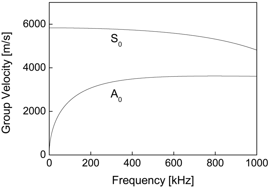 Envelopes of FBG-based guided wave signals of the intact and the damaged CFRP laminates are conducted, shown as in Figure 6(d), in which each crest denotes one wave package. To ignore the effect of multiple reflection-caused wave packages, only the first three peaks are considered, named P1, P2 and P3, respectively. According to the literature, Lamb waves are a form of elastic perturbation that can propagate in a solid plate. There are two groups of waves, symmetric and asymmetric, that satisfy the wave equation and boundary conditions for this problem and each can propagate independently of the other [24,35]. The fundamental way to describe the propagation of Lamb waves in a particular material is their dispersion curves. The dispersion of these curves begins with the solution to the wave equation for the asymmetric Lamb wave [35]. By using the equivalent mechanics parameters of the quasi-isotropic CFRP laminate [36], the dispersion curves of current CFRP laminates were derived and shown in Figure 7. It is evident that only the fundamental symmetric (S0) and the fundamental asymmetric (A0) wave modes can be excited under the central incident frequency 300 kHz and theoretical group velocities of the S0 and the A0 modes are circa 5,880 m·s-1 and 3,500 m·s-1, respectively.