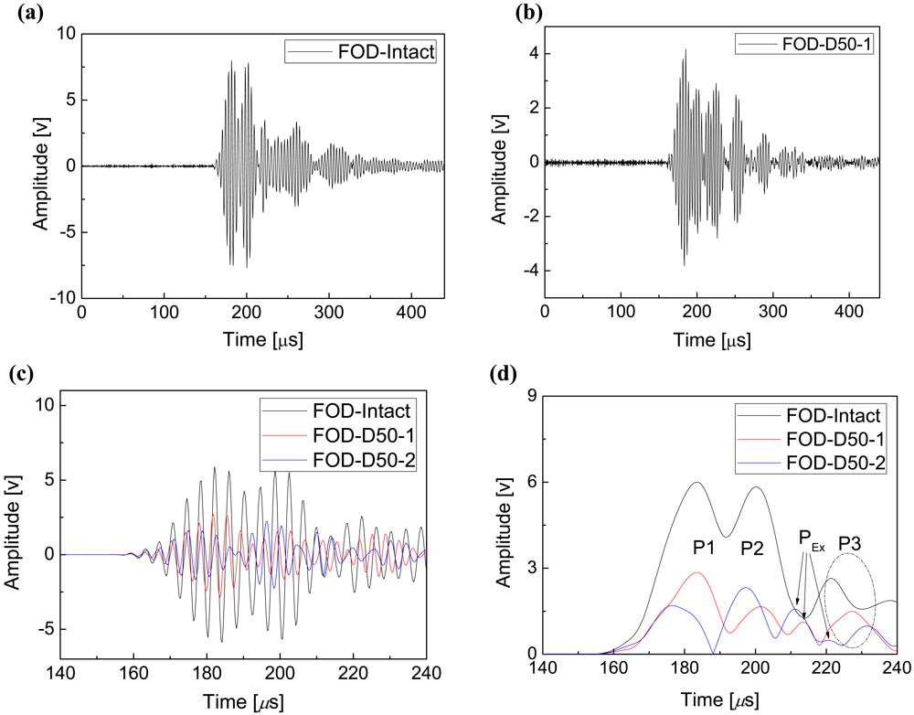 FOD-based results. Guided wave signals of the intact (a) and the single-delaminated (b) CFRP laminates. Waveforms (c) of the filtered guided wave signals of the intact and the damaged CFRP laminates and their Envelopes (d).