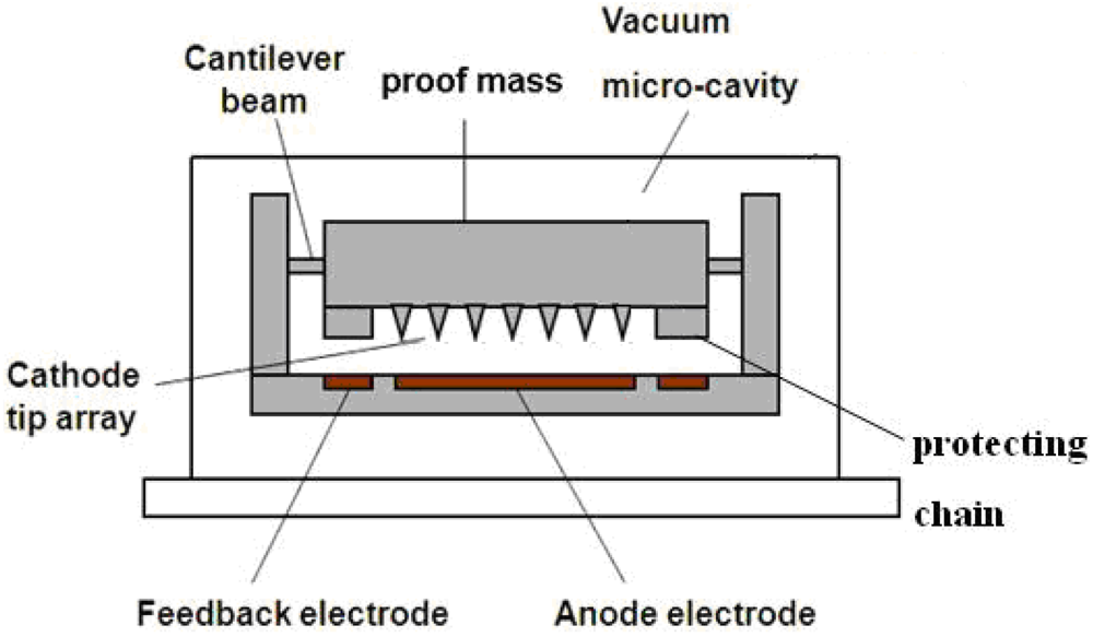 Since the vacuum microelectronic technology was proposed in 1988, the possibility of producing a high precision, good performance vacuum microelectronic sensor has been actively explored. The study of vacuum microelectronic sensors started in 1991, and since then many new types of sensors have appeared [4], such as pressure sensors, accelerometers, magnetism sensors and image sensors. Vacuum microelectronic devices are designed based on field emission theory, and the sensing part works under vacuum conditions. It utilizes the cold cathode to emit electrons, the emission current density is mainly determined by the electric field density near the tip array, which is exponential to the distance between the anode and the cathode tip array. Compared to other common well-developed accelerometers, vacuum microelectronic accelerometer has unique advantages of anti-radiation, small size, high sensitivity and the compatibility for fabrication process with integrated circuits (IC). It is widely required in applications such as small satellites, navigation, dexterous projectiles, tactical missiles and industrial automatic control [5].
