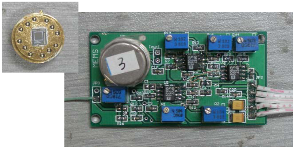 The simulation and debugging of signal detecting circuit are done. Figure 11 shows the photograph of vacuum microelectronic accelerometer with signal processing circuit.
