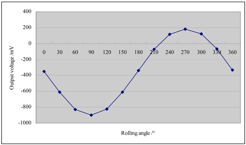 The static rolling experiment in ±1 g gravitational field is done. Figure 12 shows the output curve of the acceleration system. Where x-axis is the rolling angle and y-axis is the corresponding output voltage (mV). It illustrates that they satisfy a good sine relationship. The emission voltage is 2.478 V, and the feedback voltage is 5.112 V at 0 g input. A 12 points method is used during the testing, and the interval is 30 so that the accelerometer can be sensitive to different acceleration components [16].