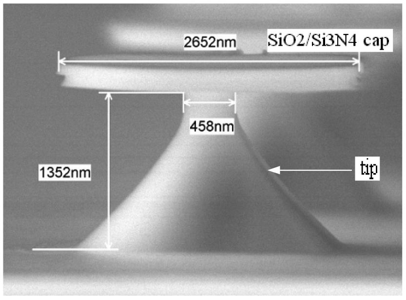 This accelerometer has been designed and fabricated. The dimensions of the accelerometer are obtained. Figure 2 is the SEM diagram of single tip. The bottom pyramid is the tip, and the top plate is the SiO2/Si3N4 cap protecting the tip from being eroded. Finally, the cap will be removed after the tip acuity. When a big enough DC voltage is added between the tip and the anode electrode, the tip will emit electrons under high electric field.