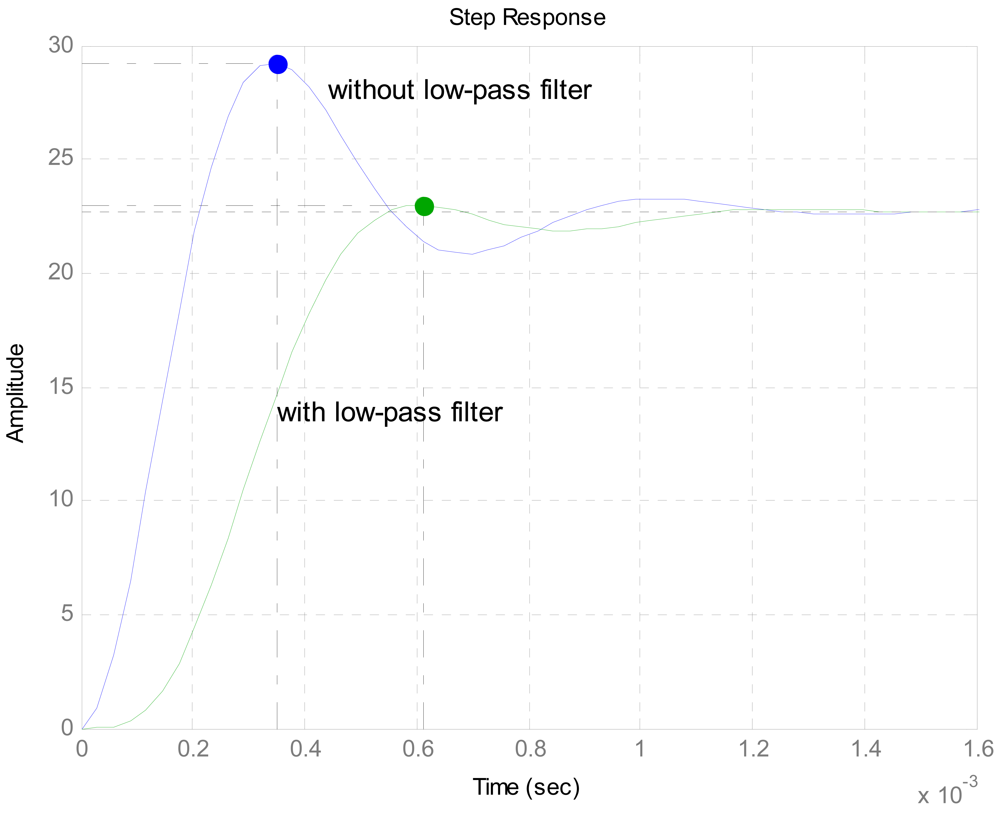 Figure 5 shows the step response of the system. It illustrates that before adding the low-pass filter, the overshoot is 28.7 %, and the adjusting time is 1.09 ms; after the low-pass filter is added, the overshoot drops to 0.59 %, and the adjusting time becomes 0.97 ms. By calculation the damping ratio of the system is 0.73 and the natural frequency is 674 Hz. It is proven that by adding a proper low-pass filter, the dynamic performance of the accelerometer is remarkably improved and the system has good performance. Here, the low-pass filter is a typical 2-order low-pass filter, and the cut-off frequency is 600 Hz. The transfer function of low-pass filter is given by Equation (10). It can be easily realized by a simple circuit using resistors, capacitors and amplifiers: