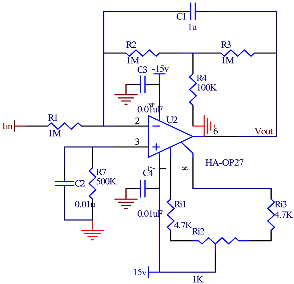 As analysed in [15], the input noise of T-style feedback circuit is mainly determined by the resistor R3, and it is far smaller than the equivalent resistance R. So the noise voltage of T-style feedback circuit will be well controlled. The noise can be eliminated at the front of the circuit.