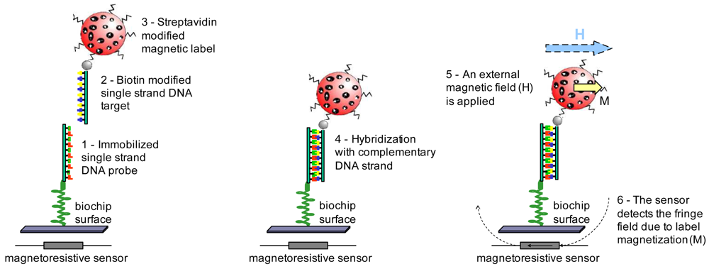 Figure 1 depicts the DNA biorecognition steps when pre-labeled targets are used []. First a DNA strand with a known sequence (probe DNA) is immobilized on the biochip surface. The biorecognition assay starts with the introduction of an unknown DNA sample (target DNA) previously specifically labeled with a MP. This target DNA corresponds to the DNA to be analyzed. If the probe and target strands are complementary, a biomolecular reaction (hybridization) occurs binding the two strands together. A washing step removes all DNA strands which were not recognized. Finally, an external magnetic field is applied to magnetize the particles. The fringe field created by the immobilized MPs is detected by the MR sensor. The sensor's electrical resistance variation is proportional to the number of biomolecular recognition events.