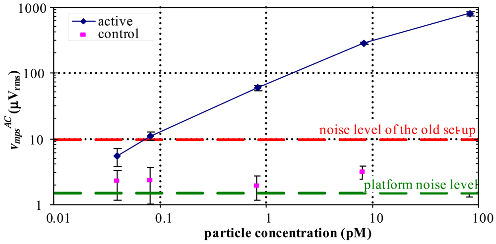 with the particle concentration is observed. The lower value of particle concentration, 41 fM, correspond to a sensor area coverage of 2% (65 particles above the sensor). To allow a relative performance evaluation of the proposed platform, Figure 10 also shows the noise level of the measurement set-up in []. As it can be observed, the noise level of our platform is about one order of magnitude lower, and the error bars that represent the standard deviation are much smaller.