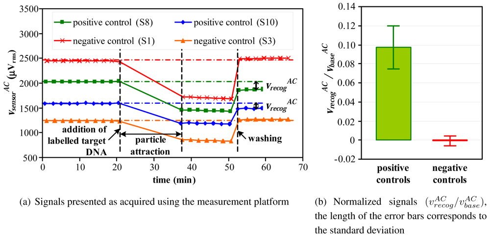 Figure 11(a) presents untreated sensor responses acquired sequentially from four different sensors in the same chip, two of them measuring the complementary binding signals (positive controls) and another two referring to non-complementary signals (negative controls). After performing the postprocessing described in Section 5.2. to compensate temperature related signal variations the acquired data was analyzed. Notice that, although in this assay particles may remain above the sensor after the wash, they are immobilized which leads to a stable sensor voltage output. This makes the correction procedure previously described valid for this type of assay. The sensing curves corresponding to non-complementary DNA probe sequences, as expected, returned back approximately to the baseline level with an average