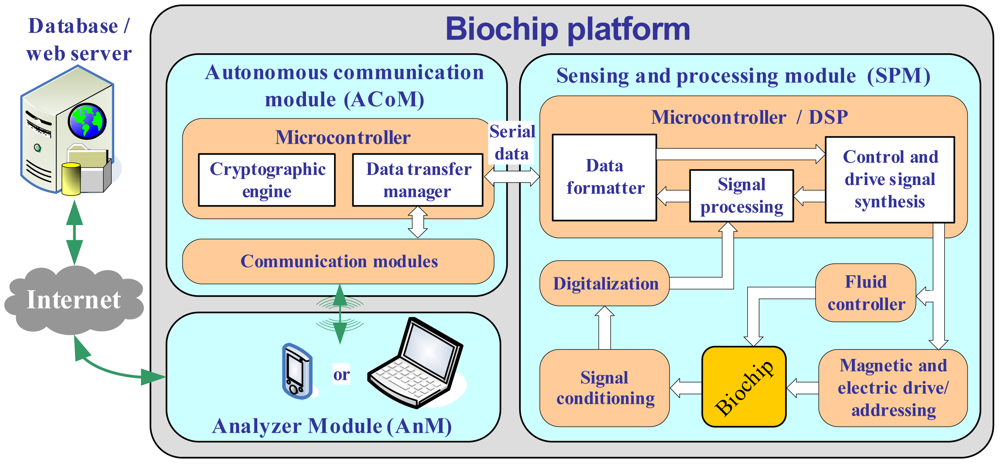 The platform is composed by three main modules: i) a sensing and processing module (SPM); ii) an autonomous communication module (ACoM); and iii) an analyzer module (AnM). The SPM and the ACoM compose an embedded system which communicates with a more general computing device, such as a PC or a PDA. The AnM allows the control of the embedded system and also provides an internet access that can be used to store experimental data on a remote server.