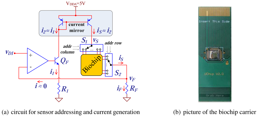 The biochip requires electric and magnetic driving signals and also a fluid controller. The required signals are generated with the supervision of the microcontroller/digital signal processor (MC/DSP) through the control of digital to analog converters (DACs). The SPM includes a sensor interface block that performs multiplexing and conditioning of each sensor's signals. Figure 4(a) depicts the electric current generator for driving and biasing the biochip sensing sites and the circuit for addressing the biochip sensing sites [picture in Figure 4(b)]. Using a current controlled through a DAC output voltage ensures high flexibility as arbitrary waveforms can be generated (e.g., the synthesis of driving signals with a configurable frequency). The MC/DSP sets the amplitude of the driving current through a DAC. Signals can be synthesized using look-up tables or by calculating complex functions in the MC/DSP. The value of the current is defined by the DAC output voltage, vDI, and the resistor RF.