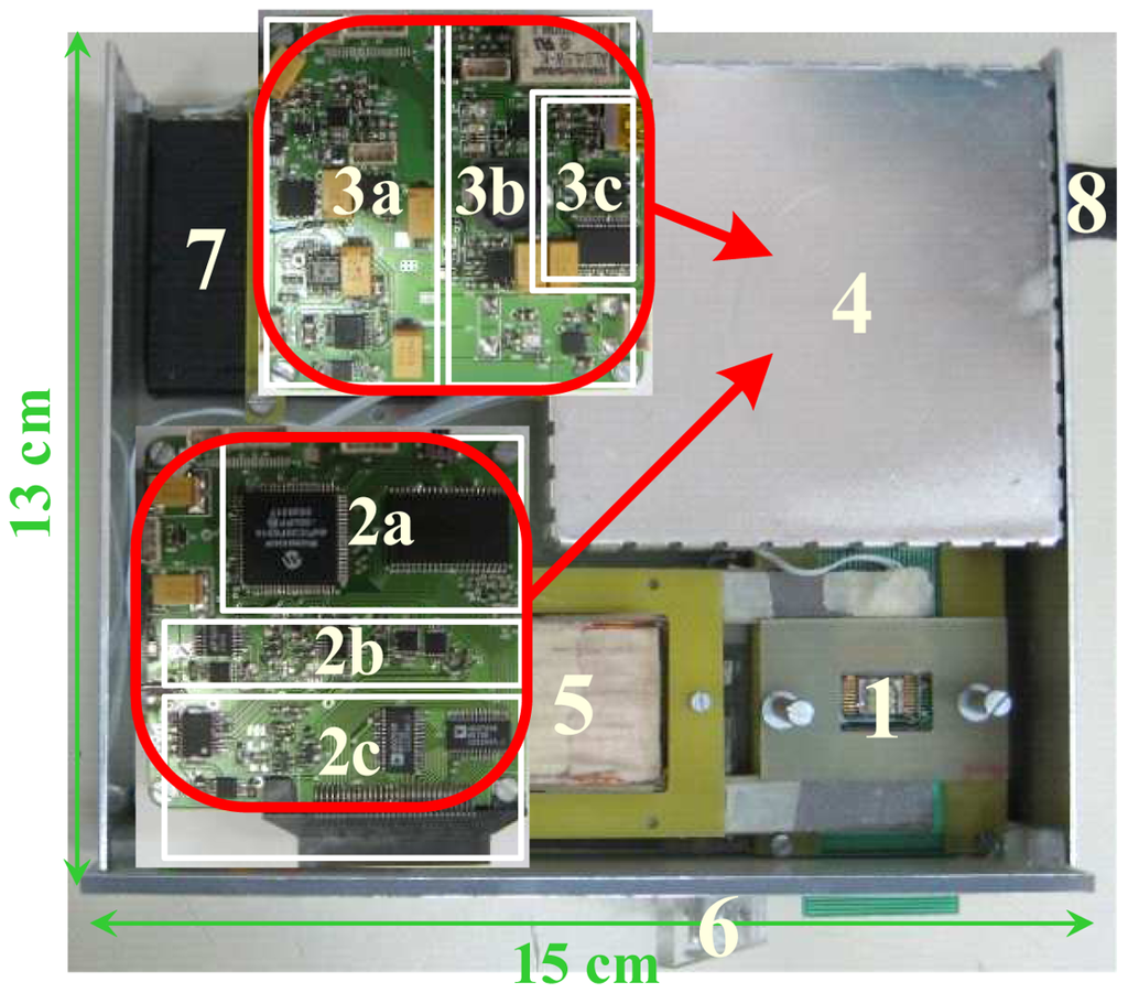 The developed portable platform prototype is depicted in Figure 5. Prototypes of the SPM and ACoM were implemented onto two printed circuit boards (PCBs) using off-the-shelf components. Both boards have equal size, only 32 cm2, and are stacked inside a steel noise shielding enclosure.