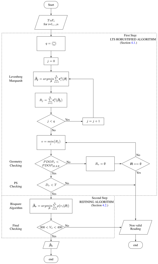 17], has the advantage of avoiding the necessity of determining an approximate range for the velocity of sound (although the range employed in this article was coarse, the result depended on the width of this range). The PS checking is included for detecting those estimations where more than two erroneous measurements are present. The result then obtained is just an intermediate estimation, that is refined with the bisquare estimator requiring a “good” starting point.