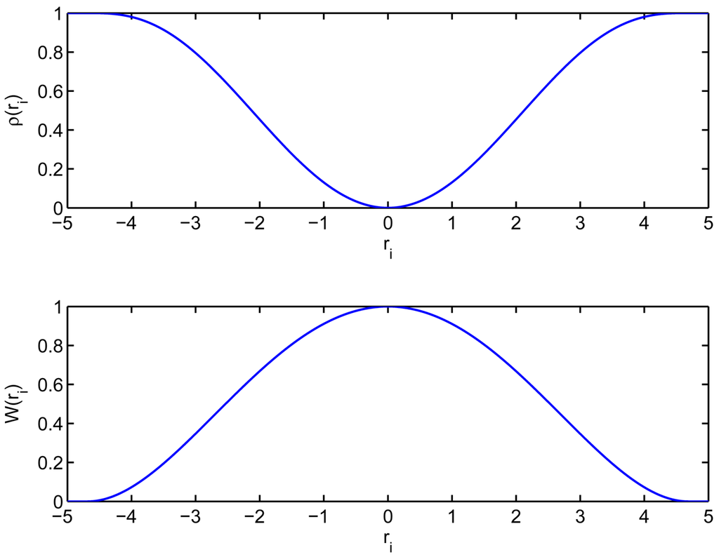M-estimation is based on the minimization of a function of the residuals, aiming at a result not influenced by outliers. The M-estimation function considered for attaining higher efficiency is the bisquare (also called biweight) function, which is a redescending estimate. This function is defined as: