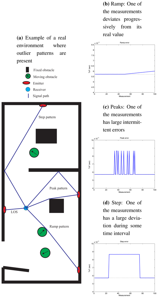 Figure 3b shows a typical outlying ramp pattern: one of the measurements deviates progressively from its true value. This pattern is produced when a moving obstacle partially occludes the direct signal path. The signal is propagated by refraction on the obstacle surface. The maximum deviation is not large, making difficult its detection.