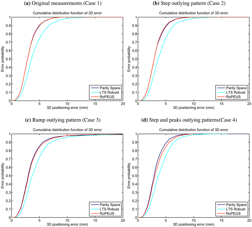 Figure 4 includes the results obtained after the first step of the RoPEUS algorithm (LTS Robust). This step give robustness under multiple outliers to the global algorithm, while the second step, whose results correspond to the RoPEUS algorithm, improves the accuracy (as can be seen in
